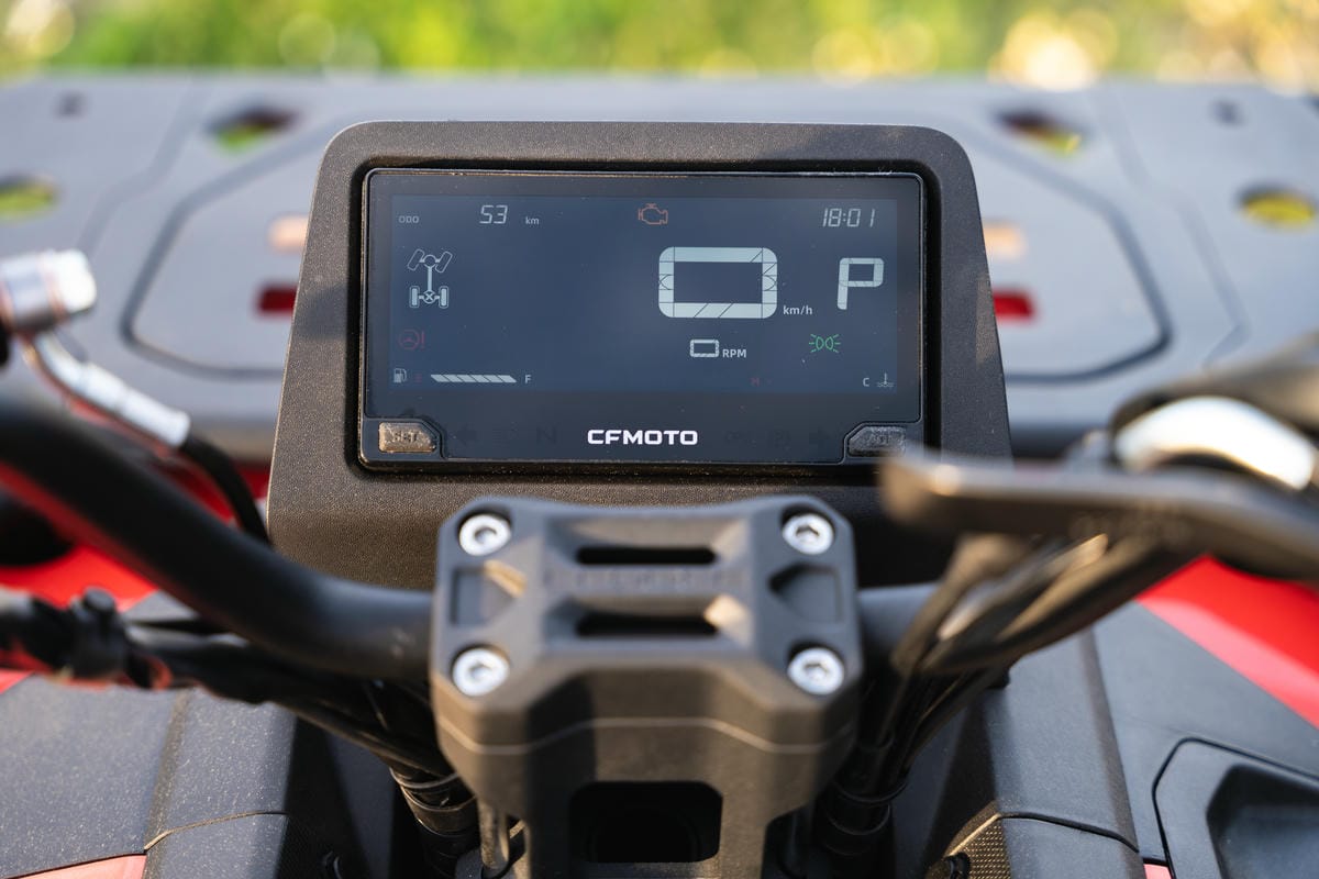 Příplatkový Komunikační modul T-BOX umožňuje přenos dat z vozidla do mobilní aplikace CFMOTO Ride. Zde je zobrazena poloha stroje, historie jízd a statistika, informace o stavu vozidla, upozornění na manipulaci se strojem a další. V aplikaci také naleznete novinky ze světa CFMOTO a informace o prodejcích a servisech. Součástí aplikace je také funkce MotoPlay, která umožňuje přenos navigace z aplikace přímo na displej vozidla.