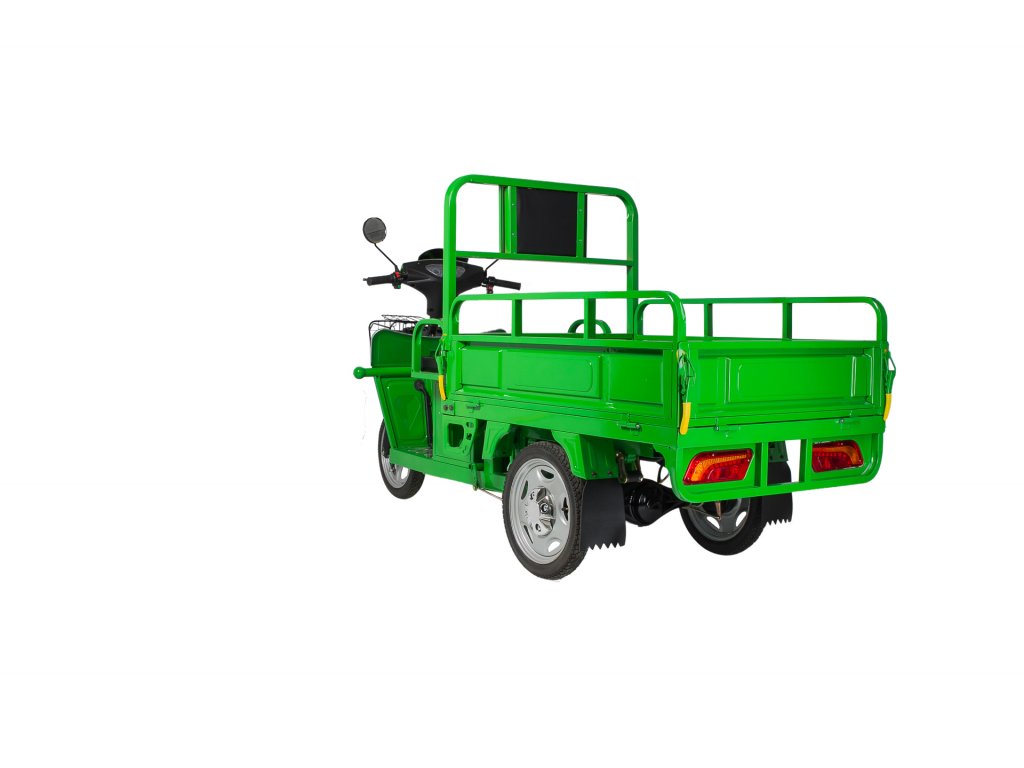 Tříkolka má také mimořádně snadné ovládání – plyn/brzda. Pro pracovní účely je vybavena sklopnou korbou, u které se navíc dají sklopit bočnice i čelo a vznikne tak rovná nízká plocha pro naložení.